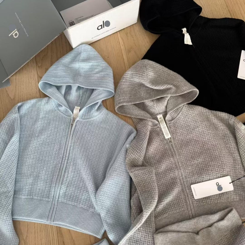This waffle knit zip hoodie combines softness, style, and comfort in one. Crafted from a breathable textured knit fabric, it keeps you warm while maintaining a flattering silhouette. Designed with a cropped fit, front zipper, and hood for a relaxed yet elevated look.